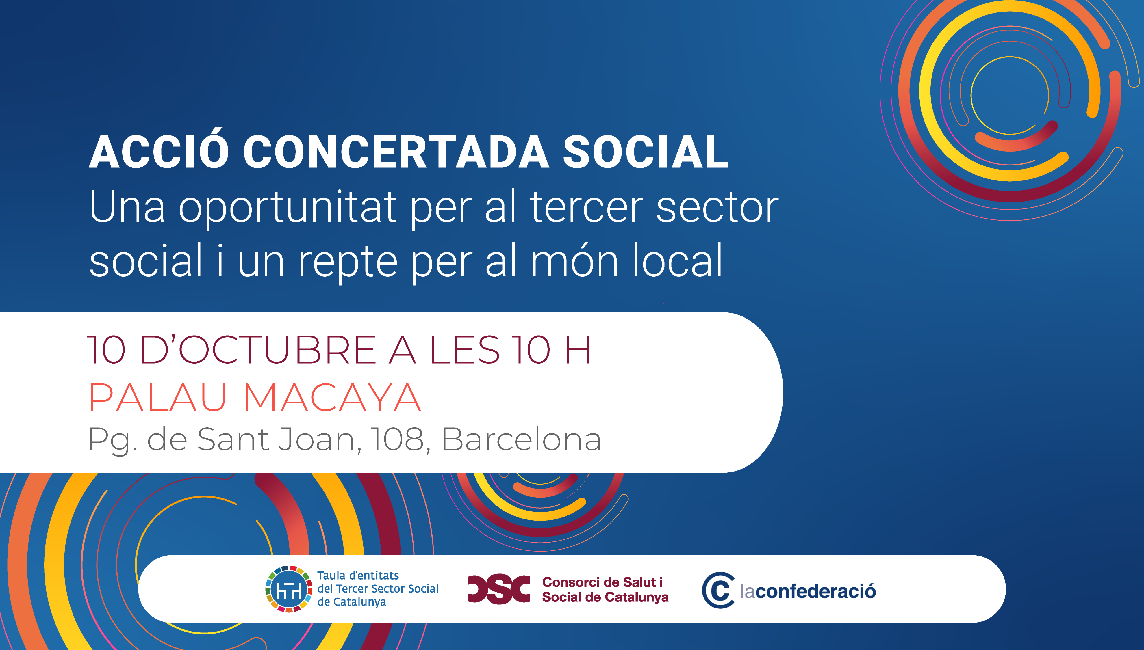 El Consorci de Salut i Social de Catalunya (CSC), conjuntament amb La Confederació i la Taula d'entitats del Tercer Sector Social de Catalunya, organitza la jornada "Acció concertada social: una oportunitat per al tercer sector social i un repte per al món local", que tindrà lloc el 10 d'octubre, a les 10 h, al Palau Macaya (Barcelona).
