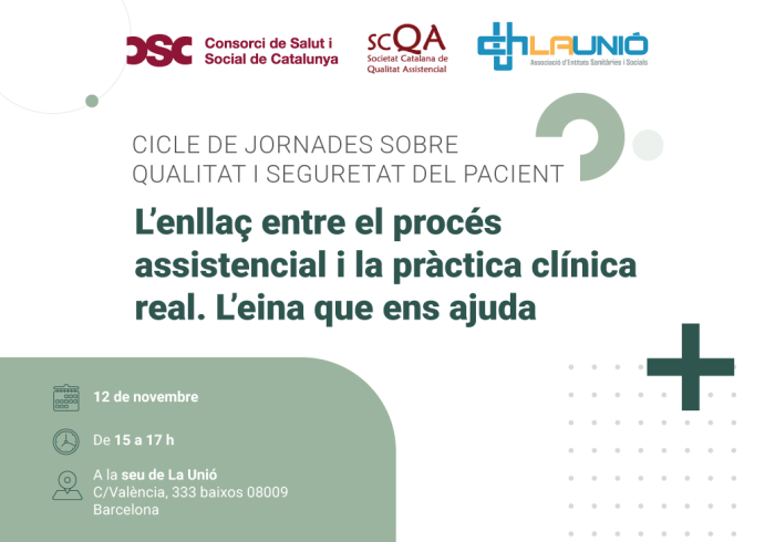 El Consorcio de Salud y Social de Cataluña (CSC) organiza, conjuntamente con La Unión y con la colaboración de la Sociedad Catalana de Calidad Asistencial (SCQA), la jornada "El enlace entre el proceso asistencial y la práctica clínica real. La herramienta que nos ayuda", que forma parte de un nuevo Ciclo de jornadas sobre Calidad y Seguridad del Paciente. Esta primera sesión tendrá lugar el 12 de noviembre, de 15 a 17 h, en la sede de La Unión.