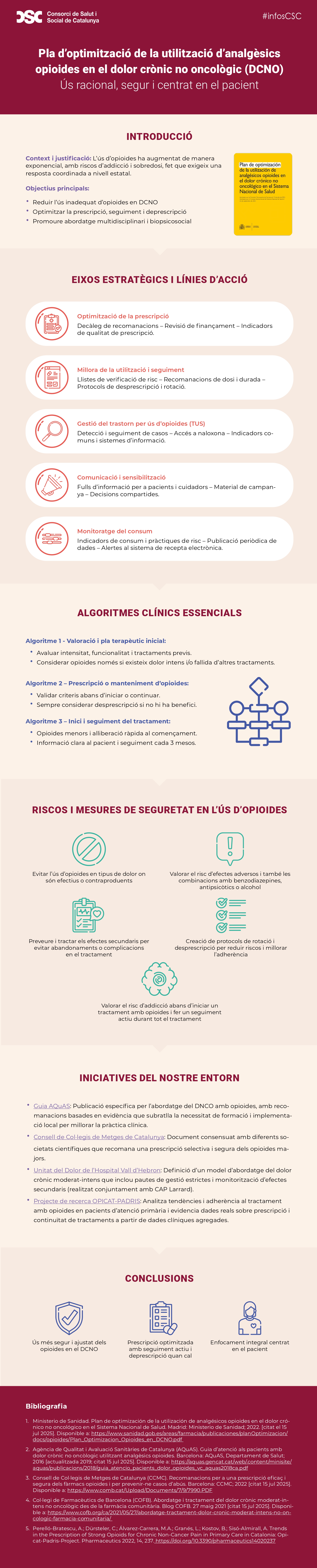 El Consorci de Salut i Social de Catalunya (CSC) ha publicat una nova #InfosCSC. Sota el títol Pla d'optimització de la utilització d'analgèsics opioides en el dolor crònic no oncològic (DCNO), la infografia explica l'estratègia coordinada a escala estatal per fer un ús racional, segur i centrat en el pacient d'aquests medicaments. El document assenyala els eixos estratègics i les línies d'acció, els algoritmes clínics essencials i els riscos i mesures de seguretat en l'ús d'opioides. A més, fa un repàs d'iniciatives en marxa en aquest àmbit. Podeu consultar la infografia en aquest enllaç.